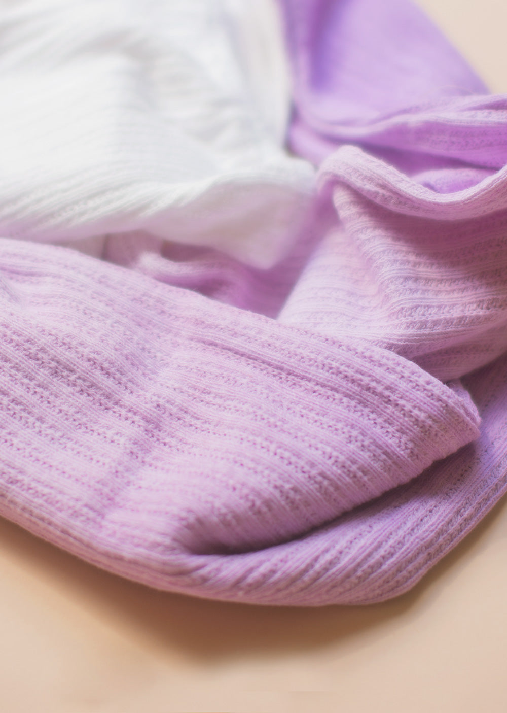 We wanted to create the prettiest pair of legwarmers we could think of! Our limited edition legwarmers are made of a comfy, cream-hued knit fabric dip-dyed in a romantic amethyst hue.